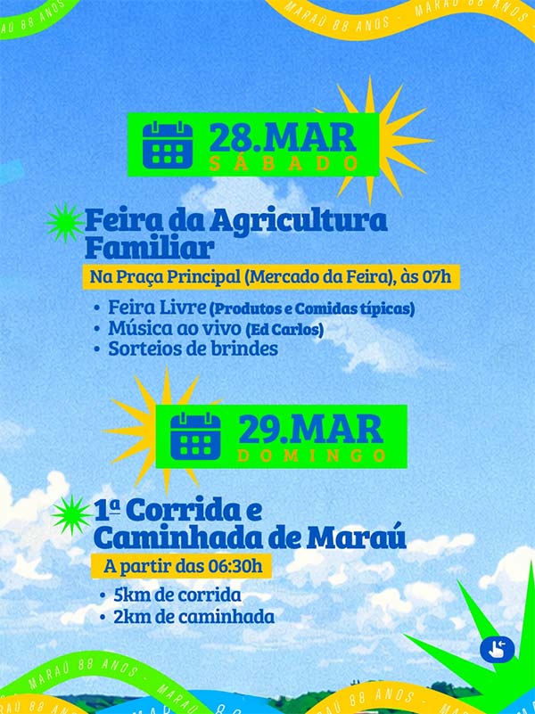 Maraú está em festa, com uma programação especial para celebrar os 88 anos da cidade, valorizando a história, a gente e tudo aquilo que os une. Serão dias de muita cultura, esporte, encontros e momentos que fortalecem a identidade local e apontam caminhos para o futuro. Participe, leve sua família e viva essa grande celebração juntos! Maraú somos nós: identidade, vozes e caminhos para o futuro!