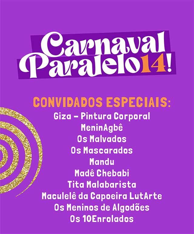 Carnaval Paralelo 14! Sábado, 14/02 tem cortejo do Bloco Paralelo 14 com muitos convidados especiais em Algodões. Concentração na Praça dos Amigos a partir das 09h, seguindo até o Obaê com duas paradas estratégicas no caminho e muita folia!