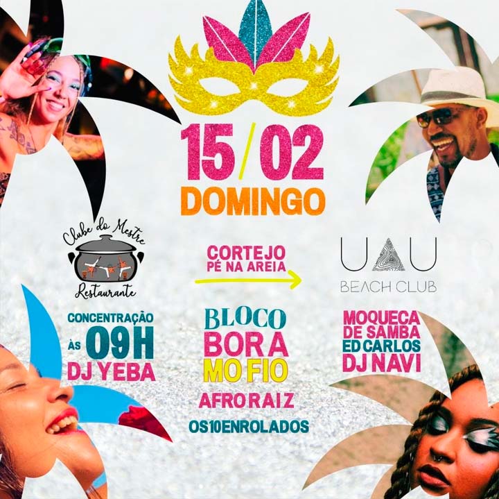 Cortejo com Afroraiz, os 10enrolados e a galera do Bloco Bora Mo Fio, e encerramento com Moqueca de Samba, Ed Carlos e DJ Navi no Uau Beach Club (Ponta do Mutá) fervendo tudo até o pôr do sol!
