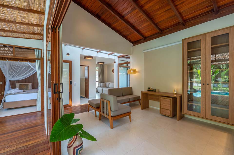 Casa de Alto Padrão em Harmonia com a Natureza. Viva a combinação perfeita entre o charme autêntico de Maraú e o conforto do luxo contemporâneo, em um espaço pensado para relaxar e aproveitar cada momento. Casa ampla e aconchegante para até 6 hóspedes, com 2 suítes e sofá-cama na sala, além de banheiro privativo. As 2 suítes contam com ar-condicionado, ventilador e camas box excelentes.