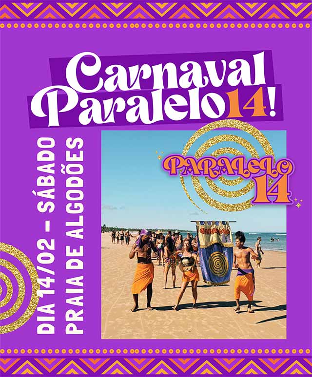 Carnaval Paralelo 14! Sábado, 14/02 tem cortejo do Bloco Paralelo 14 com muitos convidados especiais em Algodões. Concentração na Praça dos Amigos a partir das 09h, seguindo até o Obaê com duas paradas estratégicas no caminho e muita folia!